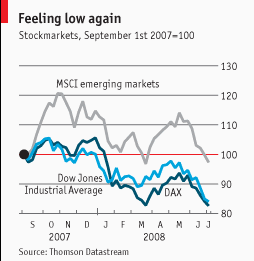 Цены на акции падают на фоне ухудшения прогноза по четырем движущим силам, управляющим фондовым рынком: экономическому росту, росту прибылей, процентным ставкам и инфляции. На данный момент две первые силы ослабевают, тогда как вторые две, наоборот, набирают обороты. Это самая худшая из всех возможных комбинаций. Растущие цены на нефть и продукты питания раздувают инфляцию. Цены на нефть 2 июля закрылись на отметке $144.14 , поскольку неблагоприятные данные по объемам запасов наложились на опасения, что нарастание напряженности между Ираном и Израилем приведет к войне в Персидском заливе. Высокие цены на сырье также нанесли серьезный удар по странам-потребителям. Стоимость импортируемых товаров оказалась значительно выше, чем стоимость экспортируемых товаров. Это делает их намного беднее.