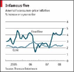 Для главы ФРС сейчас даже белое оказывается чернымВстревоженные инвесторы и политики часто полагаются на председателя Федеральной Резервной Системы, что тот сделает что-нибудь, чтобы успокоить их нервы. Но когда Бен Бернанке 15-16 июля выступал со своим отчетом по монетарной политике перед Конгрессом, он раскрыл всю правду-матку. "Существуют "серьезные риски" ухудшения состояния экономики", - сказал он, отметив, что шансы сохранения высокой инфляции "повысились". Бернанке не уточнил, какое из двух зол хуже: рецессия или инфляция. В виду такого отсутствия четкой политики напрашивается вывод, что, по крайней мере, на данный момент ФРС считает, что не может без риска изменить процентные ставки в ту или иную сторону. Учитывая то, что рынки вновь охвачены паникой по поводу кредитной "засухи" и дальнейшего падения рынка жилья, Бернанке едва ли может похвастаться хорошим здоровьем экономики. Ситуация усугубляется тем, что данные, опубликованные на второй день отчета председателя ФРС, показали, что годовая инфляция в июне выросла до 5.0% (см. график), что стало максимальным показателем с 1991 года. Низкий рост заработных плат, а также рост безработицы указывают на то, что прирост дохода от трудовой деятельности составляет менее 3%, т.е. гораздо ниже уровня инфляции. Падение реального дохода, цен на акции и цен на жилье, а также ужесточение кредитных условий - все это говорит о том, что над сектором потребительских расходов стягиваются тучи. Фирмы, обеспокоенные спросом в будущем, будут настороженно относиться к финансированию дорогостоящих проектов, даже если они смогут получить на это средства.