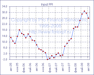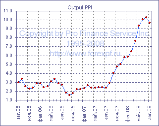 Между тем, ослабление месячных темпов роста инфляции цен производителей на выходе в августе было обусловлено в основном снижением цен на топливо, которое подешевело на 4.8% м/м, поддержав снижение индекса на 0.58%, тогда как вторым по значимости стало снижение цен на категорию "иные продукты", где цены снизились на 2.1% м/м, поддержав снижение индекса на 0.35%. Тем временем, годовые темпы роста показателя на уровне 9.7% были обусловлены ростом цен на продукты питания (+0.9% м/м до +12.5% г/г), прибавивших к индексу 1.91%, тогда как рост цен на топливо на 28.9% г/г и "иных продуктов" на 10.1% г/г обеспечило 2.82% и 1.71% соответственно. Источник: ProFinance.Ru - Новости рынка Форекс