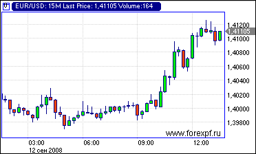 Единая валюта остановила ралли на максимуме $1.4125 и скорректировалась в область значений ниже $1.4100 под воздействием слабого отчета по промышленному производству в Еврозоне за июль. Согласно статистике, опубликованной Eurostat, общее производство с учетом сезонных факторов за месяц сократилось на 0.3% под влиянием падения производства потребительских товаров длительного пользования на 0.9%, а также производства средств производства на 0.8%. В итоге годовой показатель также зафиксировал отрицательное значение в размере -1.7%, и общее производство в июле опустилось на 1.1% ниже среднего значения за 2 квартал. Такие факты поубавили пыл участников рынка, которые все утро закрывали короткие позиции по евро против доллара на фоне разговоров по поводу возможной сделки по поглощению банка Lehman Brothers. Последние слухи говорят о том, что банк может сделать объявление в 14:00 мск.