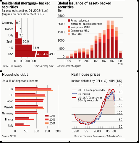 Но, среди стран Большой Семерки у ситуации в Великобритания и США есть ряд особых отличий. Первое - это высокая степень зависимости от секъюритизированного финансирования. В промежуточном отчете об ипотечном финансировании, представленном Сэром Джеймсом Кросби в Минфин Великобритании в июле, говорится о том, что на конец первого квартала 2008 года стоимость непогашенных ценных бумаг обеспеченных ипотечными кредитами на покупку жилья в США составила ?4,685 млрд. ($6,661млрд., £3,764 млрд.), а в Великобритании - ?280 млрд. (см. график). Более того, к 2006 году две трети чистого нового ипотечного кредитования в Великобритании было связано с ценными бумагами, обеспеченными ипотекой.
