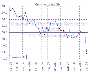 Согласно опубликованному сегодня отчету индекс ISM в обрабатывающем секторе в сентябре продемонстрировал резкое падение и составил 49.3 пункта после 49.9 (прим. ProFinance.ru: аналитики в среднем прогнозировали снижение до 49.0 пункта), и Ян Шеффердсон, главный экономист HFE, обращает внимание на то, что углубление показателя в рецессионную область к минимальным с октября 2001 года уровням стало следствием резкого ухудшения всех ключевых показателей за исключением индекс доставок, что является негативным сигналом. Индекс новых заказов в сентябре составил 38.8 пункта после 48.3 пункта, индекс новых экспортных заказов упал с 57.0 до 52.0 пункта, индекс импортных заказов - с 48.5 до 44.0, а индекс невыполненных заказов достиг 35.0 после 43.5 пункта ранее. Между тем, индекс производства рухнул с 52.1 до 38.8 пункта, индекс занятости составил 41.8 после 49.7 в августе, индекс доставок поднялся с 50.3 пункта до 52.5, а индекс запасов достиг 43.4 после 49.3 ранее. Единственным позитивным моментом в отчете стало снижение индекса уплаченных цен, который в сентябре составил 53.5 пункта после 77.0 месяцем ранее и пиковых 91.5 пункта в июне этого года. Источник: ProFinance.Ru - Новости рынка Форекс