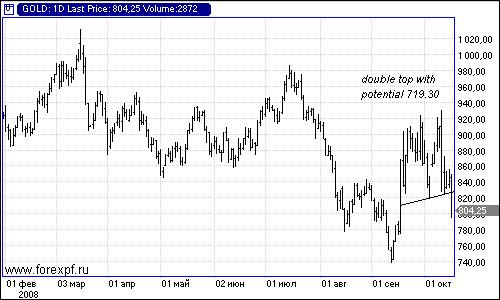 Азиатская сессия началась для золота довольно неплохо, и металл предпринял попытку пробиться к недавним максимумам, однако вновь встретил ожесточенный отпор медведей и так не смог подняться выше $850 за тройскую унцию. Разочарование быков вылилось в дальнейшую ликвидацию длинных позиций, при этом попытки золота стабилизироваться и подняться выше привлекали все новый интерес к продаже, в результате чего цены плавно снизились до $830 за тройскую унцию. Поддержка в этой области не смогла долго сдерживать натиск продавцов, в результате чего золото рухнуло ниже, причиной чего, по слухам, стало активное сокращение длинных позиций фондами, стремящимися уйти в деньги, эффект которого был дополнен исполнением стопов. Минимумы сессии к настоящему времени были достигнуты около $799.61, и в настоящее время золото держится около $802.60 за тройскую унцию, при этом принимая во внимание прорыв ниже линии шеи двойной вершины неподалеку от $826.70, металл теперь находится под угрозой дальнейшего снижения в направлении минимумов сентября около $736.19. Источник: ProFinance.Ru - Новости рынка Форекс
