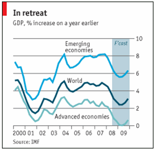 Если человека лишить доступа к кислороду, то он начнет задыхаться, потом упадет без сил и в итоге умрет. Если экономику лишить кредитования, то ситуация будет аналогичная. На усиления финансового кризиса можно говорить о том, что мировая экономика уже начала задыхаться. Поэтому центральные банки всего мира принялись за разработку чрезвычайных мер, включающих в себя акт скоординированного снижения процентных ставок 8 октября. Хорошо, если это поможет предотвратить катастрофу. Но им вряд ли удастся избежать мировой рецессии. Согласно последнему отчету по Прогнозам в мировой экономике МВФ, опубликованному 8 октября, мировая экономика "входит в стадию сильного спада" в условиях "самого опасного шока", который испытывают финансовые рынки процветающих стран впервые с 1930-х годов. Фонд прогнозирует, что на основании паритета покупательной способности темпы мирового роста в 2009 году снизятся до 3%. На этом уровне рост достигнет минимального показателя с 2002 года и вплотную подойдет к границе с рецессией. (Определение МВФ мировой рецессии включает в себя много факторов, включая процент прироста населения). Принимая во внимание низкую температуру, установившуюся на финансовых рынках, прогноз фонда кажется оптимистичным. Остальные аналитики уверены, что мировая рецессия неизбежна. К примеру, экономисты UBS прогнозируют, что в 2009 году мировая экономика вырастет всего на 2.2%.