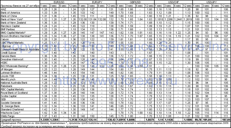 Мы обновили сводную таблицу прогнозов от крупнейших банков мира. В таблице, которая представлена ниже, все прогнозы остаются актуальными по состоянию на 27 октября 2008 года. Как и прежде мы будем регулярно публиковать сводные данные с учетом возможных пересмотров прогнозов к моменту каждой новой публикации сводной таблицы. Мы сохраняем за собой единоличное право в составлении списка финансовых институтов, включенных в сводную таблицу. Мы будем стараться отдавать приоритет таким банкам и инвестиционным домам, репутация, профессионализм и экспертный уровень которых не вызывают сомнений в мировом финансовом сообществе. Дмитрий ХрабровИсточник: ProFinance.Ru - Новости рынка Форекс