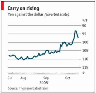 Японии повезло - ей удалось избежать пузырей на рынках жилья, кредитования и сырья. Когда западные банки страдали изо всех сил, их японские коллеги даже смогли позволить себе некоторую расточительность. Но относительно хорошие времена прошли. Закрытие спекулятивных позиций, известных как carry trades, в рамках которых в иене под низкий процент брались кредиты и вкладывались в более высокодоходные активы зарубежом, привело к укреплениию иены (см. график). Частным инвесторам продавались экзотические валютные продукты, сейчас они лишь сильнее раскручивают восходящую спираль иены. Сильная валюта угрожает прибылям крупнейших японских экспортеров, подливая масла на пылающий фондовый рынок, в котором сгорают капиталы японских банков. Чтобы сгладить негативные последствия, Банк Японии понизил ставку с 0.50% до 0.30%, на 20 базисных пунктов. Но экономика по-прежнему остается под ударом. Стоимость токийского рынка в этом году упала почти в два раза. 27 октября Nikkei-225 рухнул к своим минимумам за последние 26 лет. Во всем винят иностранные хеджевые фонды, которые продают японские акции, чтобы привлечь капитал и вернуть деньги нервничающим инвесторам. Япония - ликвидный рынок, можно сказать, банкомат Азии. Более 60% объемов торговли обеспечивается иностранцами. Когда на рынке лишь несколько местных покупателей, цены падают еще быстрее, провоцируя новые и новые продажи.