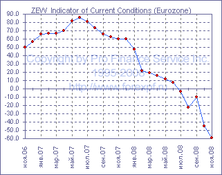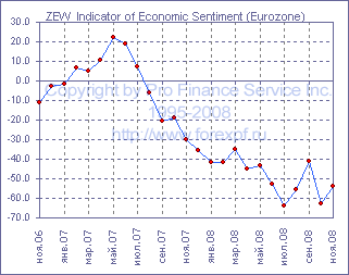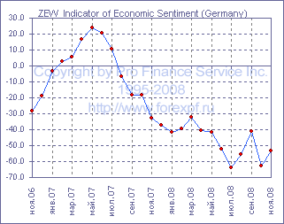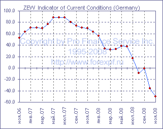 Ежемесячный отчет ZEW показал, что настрой респондентов в Германии, хотя и остается негативным, несколько улучшился, учитывая рост индекса ожиданий с -63.0 пункта до -53.5 пункта, что оказалось несколько выше среднего прогноза аналитиков, рассчитывавших на восстановление до -58.0 пункта. В то же время, оценка текущих условий претерпела существенное ухудшение, и одноименный индекс упал до -50.4 пункта после -35.9 пункта в октябре, превзойдя ожидания в -45.0 пункта и отражая эффект финансового кризиса. Между тем, в Еврозоне индекс текущих условий также упал ниже и составил -58.9 пункта после -44.7 в октябре и -10.0 в сентябре, тогда как индекс ожиданий поднялся с -62.7 пункта до -54.0 пункта. Источник: ProFinance.Ru - Новости рынка Форекс