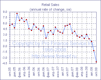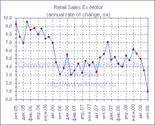 Ежемесячный отчет Департамента торговли США просигнализировал о существенном сокращении розничных продаж, при этом, в то время как последние данные Мичиганского университета и отчет Conference Board предполагали заметное ослабление потребительских расходов, падение продаж в октябре оказалось заметно хуже ожиданий и составило 2.8% м/м до -4.1% г/г (прим. ProFinance.ru: прогнозировалось снижение на 2.0% м/м) после -1.3% м/м до -1.3% г/г месяцем ранее. Между тем, без учета продаж автомобилей падение показателя также оказалось заметно хуже ожиданий в -1.0% м/м и составило 2.2% м/м до +1.0% г/г после -0.5% м/м до +3.6% г/г в сентябре. Согласно отчету, падение продаж во многом было обусловлено сокращением продаж автомобилей и запчастей у дилеров (прим. ProFinance.ru: на этот компонент приходится около 18% от общего объема продаж), которое составило -5.5% м/м после -4.8% м/м ранее, в результате чего годовые темпы снижения ускорились с 19.0% до 23.4%. Между тем, заметное негативное влияние также оказало резкое снижение продаж на автозаправках (около 11% продаж), которое составило 12.7% м/м до +0.4% г/г после -0.4% м/м до +17.2% г/г в сентябре, падение продаж в универсальных магазинах (около 12% продаж) на 0.4% м/м до +2.3% г/г после -0.6% м/м до +3.0% г/г ранее, а также продолжающееся сокращение продаж строительных материалов и сопутствующих товаров (около 7% продаж), составившее в октябре 0.4% м/м до -1.5% г/г после -0.3% м/м до -2.3% г/г. Кроме того, упали продажи одежды (-1.4% м/м до -4.0% г/г после -3.6% м/м до -3.4% г/г) и продажи вне магазинов (около 7% продаж).