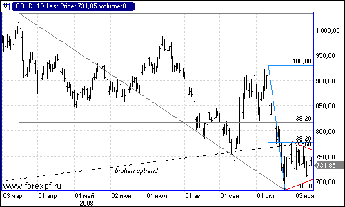 С началом новой недели ситуация на рынке золота не претерпела особых изменений: после роста в четверг, которому способствовало ралли на Wall Street, и в пятницу, когда неблагоприятная динамика фондового рынка была компенсирована фиксацией прибыли медведями на фоне сообщений со стороны China Gold Association о намерении увеличить объем вложений в золото, последнее продемонстрировало стремление продолжить восходящее движение, однако по-прежнему остается в рамках диапазона с минимумов октября. Обозначив максимумы сессии вблизи $754.28, золото к настоящему времени скорректировалось ниже и теперь держится около $735.54 за тройскую унцию, при этом текущая консолидация носит вид медвежьего треугольника, что на фоне прорыва линии тренда с 2005 года в октябре и последующих неудачных попыток вернуться выше дает основание говорить о том, что риски снижения сохраняются. Исключать новых попыток восстановления не стоит, однако пока цены держатся ниже $780 за тройскую унцию, технические перспективы выглядят весьма неблагоприятными и минимумы октября около $682 остаются под угрозой повторного тестирования, при этом порыв ниже откроет дорогу к $640, а затем и в направлении $600 за тройскую унцию. Дмитрий Храбров Источник: ProFinance.Ru - Новости рынка Forex