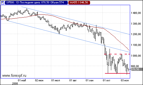 Наш технический взгляд на ситуацию, которая складывается на дневном графике индекса S&P 500, а также на взаимосвязь с динамикой курса евро/доллар, выглядит следующим образом. Мы наблюдаем формацию, которая представляет собой широкий консолидационный коридор в виде прямоугольника. Ширина консолидационного коридора обусловлена высокой волатильностью рынка, являющейся результатом низкой ликвидности. Верхняя граница находится в области важного психологического уровня 1000 пунктов. Данная фигура станет разворотной для имеющегося нисходящего тренда в случае пробития верхней границы. Мы не отрицаем возможного очередного тестирования данного важного уровня, но не видим возникновения предпосылок для его пробития в восходящем направлении.
