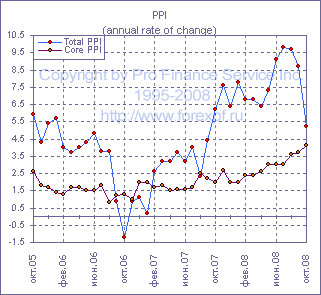 Отчет Департамента труда США показал, что инфляция цен производителей в США в октябре упала на 2.8% м/м, что оказалось заметно сильнее ожидавшихся -1.8% м/м и привело к замедлению темпов роста в годовом исчислении с 8.7% до 5.2%, однако базовый PPI в то же время вырос на 0.4% м/м (прим. ProFinance.ru: прогноз составлял +0.1% м/м), в результате чего в годовом исчислении рост ускорился с 4.1% до 4.4%. Падение цен на готовые товары, согласно отчету, было во многом обусловлено снижением цен на продукты питания на 0.2% м/м и энергоносители на 12.8% м/м, при этом в последней категории снижение приняло широкомасштабный характер, в частности рекордное падение в 24.9% продемонстрировали цены на бензин. Между тем, третий месяц продолжают снижение и цены на полуфабрикаты и сырье. Полуфабрикаты подешевели на 3.9% по сравнению с предыдущим месяцем, при этом цены на продукты питания упали на 5.5% м/м, а цены на энергоносители упали на 10.6% м/м, и в годовом исчислении рост цен замедлился с 15.4% до 10.2%. Что же касается цен на сырье, то здесь наблюдалось падение на 18.6% м/м после -7.9% г/г и в годовом исчислении впервые за долгое время была зафиксирована отрицательная динамика (-1.4%) тогда, как еще в сентябре рост составлял 26.0% г/г. Судя по отчету наблюдавшееся в последние месяцы резкое падение цен на сырье, в том числе на нефть и зерно, начинает более ощутимо проявляться в показателях инфляции, однако тревожным сигналом является рост базового индекса инфляции цен производителей, который в октябре был обусловлен ростом цен на легкие грузовики на 2.6% м/м, самолеты (+1.0% м/м) и солодовые напитки (+2.3%). В условиях крайне негативного состояния американской экономики продолжение роста базового индекса выглядит сомнительным, однако, учитывая, что пока он до сих пор продолжается, ФРС, вероятно, обратит больше внимание на столь неблагоприятную тенденцию, хотя большее значение для монетарных властей все же будет иметь динамика базового CPI. Источник: ProFinance.Ru - Новости рынка Forex