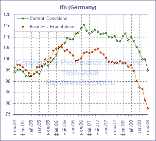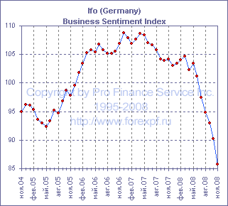 Ежемесячный отчет немецкого исследовательского института Ifo показал, что ситуация в экономике Германии продолжила стремительно ухудшаться, при этом компании значительно в меньшей степени удовлетворены текущим положением дел и теперь ожидают еще менее благоприятных условий для деятельности в ближайшие шесть месяцев. Индекс деловых настроений, согласно отчету, в ноябре упал до 85.8 пункта, что оказалось заметно ниже среднего прогноза аналитиков (прим. ProFinance.ru: 88.0 пункта) и 90.2 пункта в октябре. Между тем, падение индекса текущих условий и индекса ожиданий также оказалось заметно хуже ожиданий (прим. ProFinance.ru: 95.5 и 81.0 пункта), и их значения в ноябре составили 94.8 и 77.6 пункта соответственно после 99.9 и 81.4 пункта в предыдущем месяце. По данным Ifo, ухудшение деловых настроений было отмечено во всех секторах, при этом существенное падение было зафиксировано в промышленности (-29.0 после -20.2 пункта), в частности в обрабатывающей (-29.6 после -18.9 в октябре), а также в оптовом и розничном секторах, где индекс достиг -21.8 пункта после -15.1 ранее и -33.5 после -25.1 пункта соответственно. В секторе строительства, между тем, индекс снизился с -27.7 пункта до -30.2 пункта. Что же касается сектора услуг, то здесь индекс делового доверия упал с -4.3 пункта до -7.3, при этом индекс текущих условий составил 11 пунктов после 14 и 17 в октябре и сентябре, а индекс ожиданий упал с -21.0 до -24.0 пункта. Источник: ProFinance.Ru - Новости рынка Forex