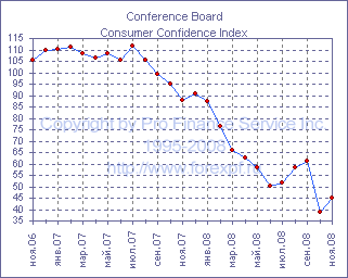 Сегодняшний отчет Conference Board показал, что потребительское доверие в США несколько улучшилось в ноябре, о чем просигнализировал рост одноименного индекса с 38.8 (прим. ProFinance.ru: пересмотрено с 38.0) до 44.9 пункта, что оказалось заметно лучше среднего прогноза аналитиков, рассчитывавших на дальнейшее снижение до 37.5 пункта. Оценка текущих условий продолжила ухудшаться и в ноябре значение индекса составило 42.2 пункта после 43.5 в октябре и 61.1 в сентябре, однако индекс ожиданий заметно подрос и составил 46.7 пункта после 35.7 ранее. Индикаторы состояния рынка труда, между тем, продолжили подавать сигналы о его дальнейшем ухудшении: индекс достаточности рабочих мест упал с 9.0 до 8.8 пункта, а индекс трудности при поиске работы поднялся с 36.6 до 37.2 пункта. Тем временем, индикаторы планируемых покупок просигнализировали о перспективах дальнейшего сокращения потребительских расходов. Индекс планируемых покупок автомобилей упал с 4.5 до 3.7 пункта, индекс планируемых покупок домов упал с 2.6 до 1.9 пункта, а индекс покупок основных приборов составил 23.8 пункта после 26.5 в октябре. Индекс однолетних инфляционных ожиданий, согласно отчету, упал с 6.8 до 5.9 пункта. Источник: ProFinance.Ru - Новости рынка Forex