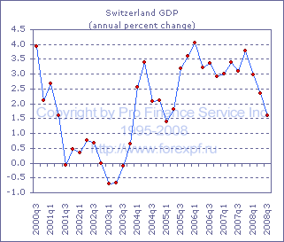 Данные по ВВП Швейцарии, опубликованные ранее сегодня, оказались несколько лучше ожиданий аналитиков, прогнозировавших снижение показателя на 0.3% по сравнению с предыдущим кварталом и сокращение темпов роста в годовом исчислении до 1.4%, и в третьем квартале текущего года экономика выросла на 1.6% г/г, при этом по сравнению со вторым кварталом ВВП не претерпел изменений. Согласно отчету, сокращение инвестиций было компенсировано за счет экспорта, а также легкого роста потребительских расходов. Инвестиции в третьем квартале сократились на 1.4%, при этом падение было замечено как в части инвестиций в строительном секторе (-0.9%), так и в инвестиции в средства производства и ПО (-1.8%). Тем временем, экспорт товаров и услуг вырос на 1.2%, тогда как импорт сократился на 0.7%. В промышленном секторе рост составил 0.8%, тогда как в секторе коммунальных услуг он составил 0.6%, а в с/х производство выросло на 0.5%. Тем не менее, в секторе финансовых услуг было зафиксировано снижение на 1.7% (прим. forexpf.ru: третий месяц подряд), тогда как в строительном секторе производство сократилось на 0.2%. В целом детали отчета подтверждают наличие тенденции к ослаблению позитивного тренда, при этом, учитывая, что Швейцарии не удастся избежать влияния финансового кризиса, в четвертом квартале и в следующем году стоит ожидать более серьезного ослабления экономики, и большинство экспертов теперь ожидает отрицательной динамики ВВП в следующем году. Источник: ProFinance.Ru - Новости рынка Forex