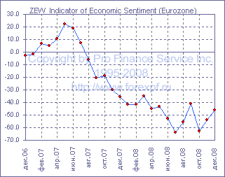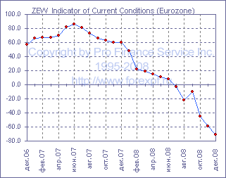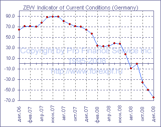 Опубликованный сегодня отчет ZEW носил весьма неоднозначный характер, принимая во внимание, что оценка текущих условий респондентами продолжила ухудшаться, однако оценка дальнейших перспектив стала менее пессимистична. Согласно отчету, индекс ожиданий в Германии поднялся с -53.5 пункта до -45.2, что оказалось заметно лучше прогноза аналитиков в -55.0 пункта, в то время как индекс текущих условий рухнул до -64.5 пункта после -50.4 в ноябре, что в целом соответствовало среднему прогнозу в -64.0 пункта. Между тем, схожая ситуация сложилась и в Еврозоне: индекс текущих условий упал с -58.9 до -71.2 пункта, а индекс текущих условий в декабре составил -46.1 пункта после -54.0 месяцем ранее. Тем не менее, в целом последние данные из Еврозоны указывают на продолжение ослабления экономики, и в, то время как принимаемые официальными лицами меры по стабилизации ситуации позитивно сказались на настроениях участников рынка, перспективы дальнейшего развития событий все же остаются мрачными. Источник: ProFinance.Ru - Новости рынка Forex