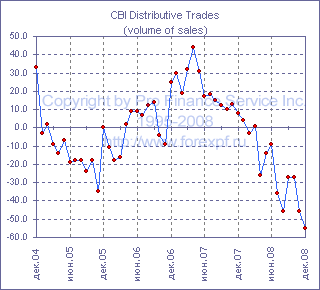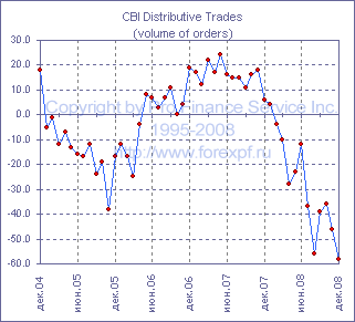 Отчет Конфедерации британских производителей, опубликованный сегодня показал, что в декабре ситуация в розничной торговле продолжила ухудшаться, учитывая, что баланс объема продаж составил -55% после -46% в ноябре и -27% в октябре (прим. ProFinance.ru: аналитики ожидали -41%), при этом объем заказов составил -58% после -46% и -46% ранее, что оказалось не только очередными низким значениями показателей, но и заметно ниже прогнозов самих респондентов в -40% и -41% соответственно. Показатель объема продаж для этого времени года, между тем, также упал ниже и составил -50% после -42%, при этом ожидаемый баланс на январь 2009 составил -51%. Что же касается ожидаемых показателей объема продаж и заказов, то они составили -49% и -48%. Источник: ProFinance.Ru - Новости рынка Forex