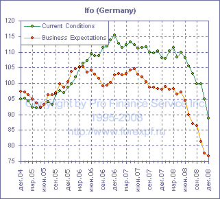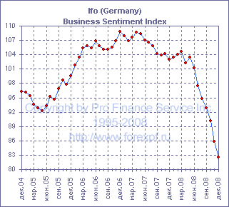 Сегодняшний отчет немецкого института Ifo показал, что ситуация в экономике Германии ухудшилась в декабре и индекс деловых настроений упал до 82.6 пункта после 85.8 месяцем ранее, оказавшись ниже среднего прогноза экономистов в 84.5 пункта. Индекс оценки текущих условий, тем временем, также оказался заметно ниже прогнозов в 90.8 пункта, а вот индекс ожиданий оказался несколько лучше ожиданий в 76.3 пункта и составил 76.8 пункта после 77.6 в ноябре. Согласно отчету, дальнейшее ослабление делового доверия в декабре наблюдалось повсеместно, кроме розничного сектора, где было отмечено восстановление с -33.5 до -30.9 пункта, однако наиболее драматичным снижение индекса стало в промышленном секторе (-35.4 против -28.9 в октябре), при этом в обрабатывающей промышленности индекс упал с -29.5 до -40.2 пункта. В строительном секторе, между тем, индекс упал с -30.2 до -30.5 пункта, а в оптовом - с -21.9 до -26.1 пункта. Что же касается сектора услуг, то здесь, в декабре деловое индекс делового доверия рухнул к -14.5 пункта после -7.3 в предыдущем месяце, при этом индекс текущих условий упал с 1 до 0 пунктов, а индекс ожиданий с -24 до -28 пунктов. Источник: ProFinance.Ru - Новости рынка Forex