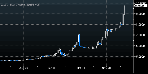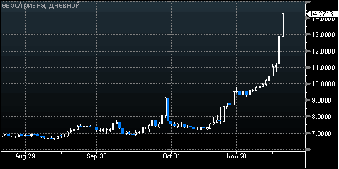 Украинская гривна за последние два дня сумела потерять в цене более 15%, и в настоящее время евро/гривна держится у свежих рекордных максимумов, обозначенных около 14.29, тогда как доллар/гривна торгуется вблизи 9.75, ранее поднявшись выше 9.78. Поводом для ускорения падения национальной валюты Украины стал резкий рост опасений относительно дальнейших перспектив, учитывая продолжающуюся эскалацию экономического кризиса, а также сохраняющийся острый политический кризис в стране. Ослабление гривны выглядит позитивным с точки зрения влияния на дефицит текущего счета, однако в остальном оно лишь усугубляет четкие негативные тенденции в экономике, и, по словам помощника президента Украины по экономическим вопросам Романа Жуковского, может обернуться ростом числа дефолтов по обязательствам бизнеса и потребителей - процент дефолтов по официальным оценкам может составить около 60%, учитывая, что более половины кредитов были выданы в долларах. В свете вышесказанного последние данные по задолженности Украины произвели весьма неблагоприятное впечатление на инвесторов, поддержав усиление давления на гривну. На начало октября объем внешней задолженности достиг $105.4 млрд. (прим. ProFinance.ru: около 60% ВВП), увеличившись на 7.6% по сравнению с концом второго квартала, когда он составлял $98 млрд., при этом государственный долг слегка сократился и составил $14.20 млрд. против $14.873 млрд. ранее, заимствования корпораций выросли на 9% до $44.339 млрд., а долг банков увеличился на 9.58% до $42.117 млрд. Особое беспокойство у инвесторов вызывает краткосрочная задолженность в размере около $30 млрд., при этом уже $4.1 млрд. должно долга подлежит уплате уже в декабре. По оценкам экономистов RBS, у Национального Банка Украины еще должны сохраняться какие-то средства, оставшиеся от кредита МВФ, однако они обращают внимание на то, что для того, чтобы можно было говорить об изменении перспектив, которые на данный момент выглядят крайне негативными, требуются активные антикризисные меры и реформы. Разработка и принятие таковых, между тем, остается под вопросом в виду сложившейся на Украине политической ситуации. Источник: ProFinance.Ru - Новости рынка Forex