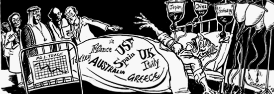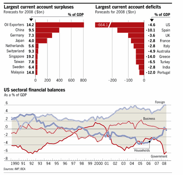 Ожидается, что доля стран-экспортеров нефти составит 813 миллиардов долларов. Удивительно, но предполагается, что в ряде стран-импортеров нефти также образуются огромные излишки. Лидерами здесь являются Китай (399 млрд. долларов), Германия (279 млрд. долларов) и Япония (194 млрд. долларов). Согласно прогнозам, профицит текущего счета в Китае, как доля валового внутреннего продукта, достигнет поразительной отметки в 9.5%, в Германии - 7.3%, в Японии - 4%. В общем, предполагается, что на долю экспортеров нефти и этих трех стран придется 83% всех излишков. Страны с активным платежным балансом часто сравнивают свое благоразумие с расточительностью других стран. Однако некоторые страны не могут тратить меньше того, что они зарабатывают, при том, что другие не тратят больше. Кредиторам нужны заемщики. Без них кредиторы просто разорятся. В 2008 г. значительный дефицит отмечен в следующих странах (по порядку) - США, Испания, Великобритания, Франция, Италия и Австралия. По объему заемных средств США сильно опережают всех остальных. Предполагается, что на эти шесть стран придется 70% мирового дефицита. (Также следует отметить, что профицит самого по себе мирового сообщества составит 350 миллиардов долларов).