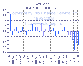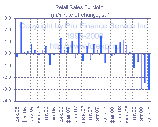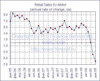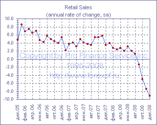 Розничные продажи в США в декабре продемонстрировали неожиданно сильное падение, сократившись на 2.7% по сравнению с предыдущим месяцем, в результате чего годовые темпы падения достигли 10.8% г/г, при этом снижение продаж без учета автомобилей на 3.1% м/м (прим. forexpf.ru: ожидалось снижение на 1.2% м/м и 1.8% м/м соответственно) также стало неприятным сюрпризом для участников рынка. Согласно отчету, слабость потребительских расходов в последний месяц 2008 года носила широкомасштабный характер, и позитивная динамика была замечена лишь в части магазинов продукции здравоохранения и личного ухода (+0.4% м/м до +5.2% г/г против +0.5% м/м до +4.4% г/г в ноябре), а также в части категории "прочие ритейлеры" (+0.5% м/м до -1.8% г/г после -2.9% м/м до -3.1% г/г), при этом, учитывая, что на эти сектора приходится менее 10% от общего объема, благоприятное влияние на конечный показатель носило весьма ограниченный характер. Тем временем, максимальное падение было вновь отмечено на бензозаправках, где оно составило 15.9% м/м до -35.5% г/г после -18.3% м/м до -25.4% г/г месяцем ранее, тогда как заметный негативный эффект также оказало сокращение продаж в продуктовых магазинах на 1.4% м/м до -1.3% г/г после -0.1% м/м до +3.3% г/г в ноябре и, конечно же, снижение продаж автомобилей на 0.7% м/м до -22.4% г/г после -0.3% м/м до -23.5% г/г ранее. Продажи строительных материалов, между тем, упали на 2.9% м/м после -2.8% м/м ранее, в результате чего годовые темпы снижения достигли 8.9% после 8.8%, продажи в ресторанах и кафе упали на 2.2% м/м до -0.5% г/г после +1.0% м/м до +3.6% г/г в ноябре, а продажи в универмагах сократились на 1.3% м/м до -0.4% г/г против +0.8% м/м до +2.1% г/г. В целом отчет носит крайне неблагоприятный характер, и свидетельства дальнейшего ослабления рынка труда не позволяют ожидать корренного изменения ситуации в ближайшие несколько месяцев. Источник: ProFinance.Ru - Прогнозы курсов валют