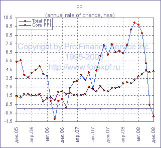 Инфляция цен производителей в США, как и ожидалось, снизилась в декабре, однако ослабления ценовых давлений оказалось несколько слабее, чем предполагали экономисты: общий PPI упал на 1.9% м/м до -0.9% г/г, тогда как базовый вырос на 0.2% м/м до +4.3% г/г (прим. ProFinance.ru: прогнозы составляли -2.0% м/м до -1.2% г/г и +0.1% м/м до +4.2% г/г соответственно), при этом цены на продукты снизились на 1.5% м/м после +0.0% м/м в ноябре, а цены на энергоносители упали на 9.3% м/м после -11.2% в ноябре. Между тем, цены на полуфабрикаты в декабре упали на 4.2% м/м до -1.7% г/г после -4.3% м/м до +2.6% г/г ранее, а цены на сырье сократились на 5.3% м/м до -25.0% г/г после -12.5% м/м до -19.4% г/г в ноябре. Цены на продукты питания в этих двух категориях упали на 3.4% м/м и 5.3% м/м после -2.4% м/м и -1.2% м/м, а цены на энергоносители - на 9.5% м/м и 6.0% м/м после -12.3% м/м и -18.7% м/м месяцем ранее. По данным BLS, снижение цен на энергоносители в категории готовых товаров было обусловлено, в частности, снижением цены на сжиженный нефтяной га, который упали на 21.8% м/м после -33.4% м/м ранее, тогда как также упали цены на природный газ, а цены на электроэнергию выросли слабее, чем в прошлом месяце; цены на керосин, печное топливо и дизель, тем временем, упали сильнее, чем в ноябре. Рост базового PPI, между тем, стал результатом роста стоимости автомобилей, фармацевтических препаратов, легких грузовиков и гражданских самолетов, который нивелировал эффект снижения цен на потребительские товары из пластика, запоминающие устройства, силовые и распределительные трансформаторы и алкогольные напитки. Источник: ProFinance.Ru - Прогнозы курсов валют