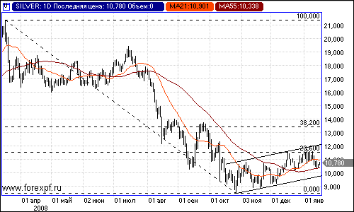 Серебро вчера отскочило от 55-дневной скользящей средней, которая ранее уже сдерживала попытки пробиться ниже, что позволило быкам перейти в контрнаступление. В рамках последнего металлу удалось подняться к $10.80/90 (область консолидации последних торговых сессий/21-дневная скользящая средняя), при этом, судя по динамике часовых индикаторов, движение вполне может получить продолжение по направлению к $11.75/60 (максимумы декабря/начала января), но анализ более долгосрочных графиков указывает на то, что покупателям следует соблюдать осторожность, хотя техническая картина в целом пока выглядит конструктивной. Серебро остается выше линии поддержки с минимумов октября, но стоит обратить внимание на то, что стремление драгоценного металла продемонстрировать более активное восстановление до сих пор оказывалось недостаточно сильным, чтобы преодолеть сопротивление в области $11.75/50, где проходит уровень коррекции Фибоначчи в 61.8% от снижения с максимумов сентября и 23.6% от снижения с максимума 2007 года, а восходящая коррекция последних двух месяцев развивалась в рамках диапазона, весьма напоминающего медвежий флаг. Прорыв и закрытие ниже 55-дневной скользящей средней в подобных условиях будет тревожным сигналом для быков, открывая дорогу первоначально к $10.10/00, а затем к $9.75/70, при этом потеря поддержки в этой области укажет на потенциал более существенного снижения. Дмитрий Храбров Источник: ProFinance.Ru - Прогнозы курсов валют