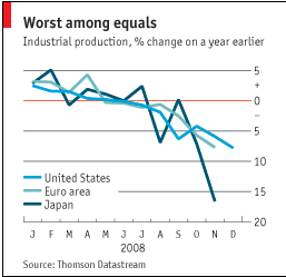 В ноябре объем экспорта упал на 27% в годовом исчислении. В декабре картина только ухудшилась - падение экспортного объема составило 35%. Основной причиной стал экономический спад в Соединенных Штатах, где объем импорта сократился на 36.9% по сравнению с предыдущим годом. В свою очередь, мировой спад ударил по каналам поставок в Азии, что привело в декабре к падению экспорта Японии в Китай на 35.5%, причем объем экспорта "восточноазиатским тиграм" (в Гонконг, Сингапур, Южная Корея и Тайвань) упал еще больше, чем экспорт в Америку. Экспорт составляет почти половину всего производства в секторе обрабатывающей промышленности Японии, поэтому падение в этом секторе будет самым значительным за всю историю ведения статистических данных: в ноябре 2007 года объем производства упал на 13%. Заказы на машинное оборудование - первый индикатор предстоящих событий - в декабре прошлого года упали на 72% в годовом исчислении. Хироси Сирайси из BNP Paribas полагает, что к декабрю промышленное производство уже упало до минимума 2001 года, зафиксированного после пузыря, уничтожив весь шестилетний рост, считавшийся устойчивым восстановлением. К тому моменту, как падение закончится, г-н Сирайси прогнозирует падение объема производства до уровня 1987 года. Тот спрос на экспорт, который способствовал экономическому восстановлению Японии после 2002 года, был основан исключительно на автомобильной промышленности и потребительских технологиях - отраслях, падение в которых стало наиболее значительным. Автопроизводители, к примеру, сократили производство примерно вполовину, со всеми вытекающими последствиями для производителей стали, микрочипов и химических реагентов.