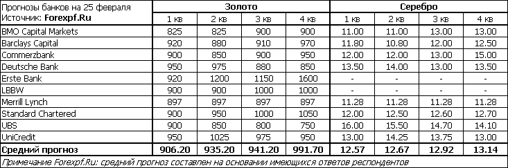 Ниже представлена таблица прогнозов ряда ведущих мировых банков по ценам на золото и ценам на серебро на 2009 год. Текущая цена золота на споте $963.90, серебра - $13.88 за тройскую унцию. Источник: ProFinance.Ru - Новости экономики,товарного и валютного рынка Форекс