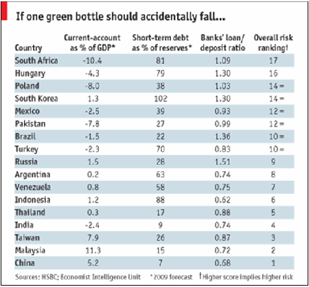 Третий индикатор, соотношение банковских кредитов и вкладов, - отражает степень уязвимости банковских систем. Когда данное соотношение превышает 1.0 (как, скажем, в России, Бразилии, Южной Корее и Венгрии), это значит, что банки зависят от займов, часто иностранных, необходимых для выдачи внутренних кредитов, и, следовательно, окажутся в тисках мирового кредитного кризиса. Чтобы разобраться в том, что лежит в основе финансовой уязвимости, мы проранжировали все страны по трем показателям, а затем взяли их средний балл. Если бы мы включили все развивающиеся страны, то во главе списка стран с повышенным риском оказались бы такие восточноевропейские страны, как Латвия, Украина и Румыния. Среди 17 крупных экономик, представленных в таблице, наиболее рискованными выглядят ЮАР и Венгрия; самый низкий риск - в Китае. Венгрия уже была вынуждена пойти на поклон к МВФ, чтобы получить кредит. В таком же положении может оказаться и ЮАР. Несмотря на высокие цены на золото, уменьшение экспорта полезных ископаемых приводит к увеличению дефицита текущего счета страны, возможно до 10% от ВВП в этом году, в тоже время из-за предполагаемого сокращения общих прямых инвестиций из заграницы страна вынуждена занимать еще больше. Ранд, который уже резко упал в стоимости, остается одной из самых уязвимых валют в развивающемся мире.