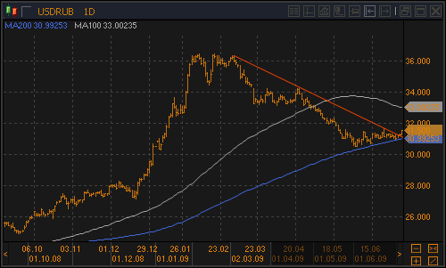 Российская валюта начала сегодняшний день с падения, и, учитывая продолжающуюся нисходящую коррекцию на рынке нефти, а также сохраняющийся на рынке акций негативный настрой и снижение цен на металлы, медведи продолжают активно продавать рубль. Ситуация на фондовых рынках, как в части динамики цен в последние недели, так и в части изменений в настрое инвесторов дает основание ожидать дальнейшего ослабления аппетита к риску, что будет предполагать сохранение давления на рубль. Кроме того, негативным фактором для последнего является и техническая картина, в частности стоит отметить, что доллар/рубль последнее время демонстрировал консолидацию выше 200-дневной скользящей средней, а на прошлой неделе вышел из канала с максимумов этого года. В настоящее время пара держится около 31.50, и попытки снижения в направлении 31.00 имеет смысл рассматривать как возможность для открытия длинных позиций в доллар/рубле со стопом ниже 30.40 и первоначальной целью на 33.00. Дмитрий Храбров Источник: ProFinance.Ru - Новости рынка Форекс