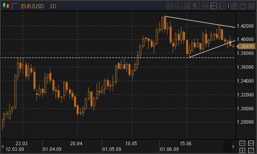 Рассмотрим график дневного периода валютной пары евро/доллар. Тенденция отсутствует, поскольку динамика цен носит исключительно диапазонный характер. В настоящее время, с позиции среднесрочного взгляда, курс движется в диапазоне, который сверху ограничен максимумами 3 июня в области 1.4340. Нижняя граница диапазона находится в области 1.3740/50. Она формируется максимумом 19 марта в области 1.3740 и минимумом 16 июня в области 1.3750 (на графике белая пунктирная линия).