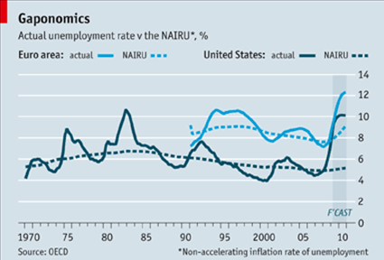 Бесспорно, рецессия тоже может вызвать снижение потенциального производства. Вопрос в том, каким будет его размер? В своем последнем Экономическом прогнозе ОЭСР приходит к выводу, что сокращение деловых инвестиций приведет к замедлению роста потенциального производства в Америке в этом и следующем году, но не к снижению. Предполагается, что Nairu существенно вырастет в Еврозоне, где на недостаточно гибких рынках труда уволенным сложнее найти новую работу, и за это время они утрачивают свои профессиональные качества. Но в США, где рынок труда более гибок, рост Nairu будет незначительным (см. график).