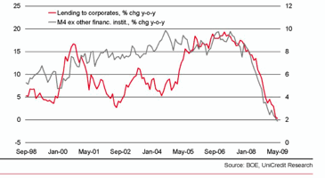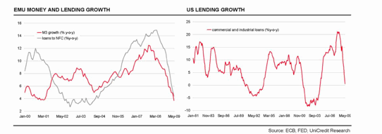 За время двухлетнего спада кризис кредитования превратился из призрака, от которого отмахивались, как от чего-то неправдоподобного, в дамоклов меч, занесенный над головой еще ослабшей реальной экономики. На ранних этапах кризиса центральные банки успокаивали себя тем, что темпы роста кредитования были настолько высокими, что коррекция была неизбежной. Однако с начала прошлого года темпы роста кредитования резко снизились, и до сих пор не показывают признаков стабилизации, что вызывает панику среди центральных банков (см. графики)