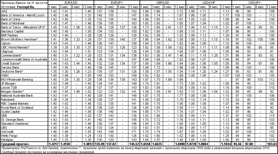 Мы обновили сводную таблицу прогнозов от крупнейших банков мира. В таблице, которая представлена ниже, все прогнозы остаются актуальными по состоянию на 31 августа 2009 года. Как и прежде мы будем регулярно публиковать сводные данные с учетом возможных пересмотров прогнозов к моменту каждой новой публикации сводной таблицы. Мы сохраняем за собой единоличное право в составлении списка финансовых институтов, включенных в сводную таблицу. Мы будем стараться отдавать приоритет таким банкам и инвестиционным домам, репутация, профессионализм и экспертный уровень которых не вызывают сомнений в мировом финансовом сообществе. Дмитрий Храбров Источник: ProFinance.Ru - Новости рынка Форекс