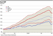 Во-первых, даже в условиях рецессии ВВП Великобритании вырос гораздо сильнее, чем ВВП крупнейших стран континентальной Европы или Японии. С первого квартала 1991 г. по третий квартал 2009 г. ВВП Великобритании вырос на 48% против 35% во Франции, 22% в Германии, 19% в Италии и 16% в Японии. Среди группы семи ведущих государств с высоким уровнем дохода только США и Канада опередили Великобританию, в них ВВП вырос на 63% и 60% соответственно. Во-вторых, часть этих показателей может оказаться миражом. Но если темпы роста в Великобритании не опустятся ниже уровня других европейских стран и Японии с начала 1991 г. до начала кризиса (1.1% в Японии, 1.5% в Германии и Италии и 2.1% во Франции), и показатели этих стран резко не вырастут (что кажется маловероятным), Великобритания сохранит свое преимущество, полученное в годы экспансии. Безусловно, эпоха реформ не прошла даром. В-третьих, стабилизация была недостаточной. Так, до кризиса финансовый долг - чистый долг к ВВП в размере около 40% - и текущие дефициты были слишком высокими, лишая страну места для маневра. Это привело к неблагоприятным последствиям. Высок риск того, что впереди у Великобритании 20 лет жесткой экономии, 10 из которых уйдут на восстановление контроля над дефицитами, а еще 10 - на сокращение долгов до первоначального уровня. В конечном счете для предотвращения этого нежелательного развития событий потребуется катастрофическое инфляционное обесценение или восстановление роста. Чем более быстрым будет рост, тем проще будет управлять финансовым кризисом. Путь наименьшего сопротивления к росту связан с надеждой на то, что свободная монетарная политика в разных странах мира будет способствовать возрождению, хоть и не реформированного, финансового сектора, что удержит экономику Великобритании на плаву. Это опасно как в экономическом (из-за нестабильности), так и финансовом плане (в связи с возможными высокими затратами). Великобритания едва ли может позволить себе обеспечить стабильность своего финансового сектора, не говоря уже о мировой финансовой системе.