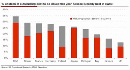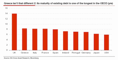 Насколько дела у Греции хуже, чем у остальных стран мира? Дилайн Грайс из Societe Generale считает, что ненамного. Он подчеркивает, что во многих отношениях она даже выгодно выделяется на фоне других, что должно стать для всех нас тревожным сигналом. В частности, Грайс составил полезный график, из которого видно, что в Греции (и Великобритании) государственный долг гораздо более долгосрочный, чем в большинстве других государств.