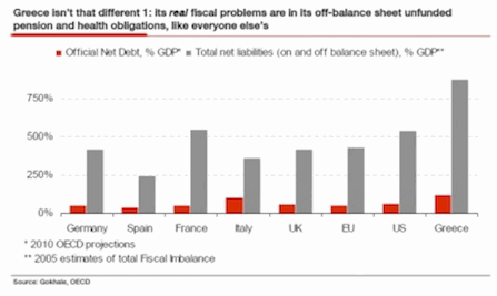 В то же время следует помнить о том, что у Греции крайне большой дефицит текущего счета и недостаток чистых инвестиций (представляющих собой совокупный баланс страны). Но в этом отношении другие страны, представленные на графиках, не лучше Греции. В чем же разница? Просто-напросто Греция внезапно потеряла доверие рынков. Так что, в конечном счете, решающим фактором был простой каприз инвесторов. Вот что говорят власти Греции по этому поводу: "Наиболее пугающее сходство между Греций и всеми остальными странами заключается не в том, что размер их долга примерно равен, а в понимании, что устойчивость бюджета держит всех нас мертвой хваткой, и каждый из нас зависит от переоценки суверенного риска г-ном Рынком, известным своим непостоянством". Перед западными государствами возникла долгосрочная дилемма (которая существовала и до начала кризиса, но сейчас занимает умы абсолютно каждого). За последние 50 лет Запад превратился в ряд крайне благополучных государств, экономики которых были просто не в состоянии найти достаточно наличных средств для финансирования такого благосостояния. Проблема обобщена на последнем графике.