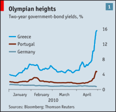 Покипев несколько месяцев, кризис суверенного долга в Греции вылился за край и охватил всю Еврозону. Финансовой помощи в размере 45 млрд. евро (60 млрд. долларов), обещанной МВФ и коллегами страны по Еврозоне, больше недостаточно, чтобы убедить частных инвесторов в привлекательности греческих государственных облигаций. Противники спасения в Германии подчеркивают, что Греция потеряла доверие рынков, когда 27 апреля агентство Standard and Poor’s (S&P) понизило рейтинг греческих государственных облигаций до BB+, что немного ниже инвестиционного уровня. Данное рейтинговое агентство также снизило кредитный рейтинг Португалии до A-, а днем позже - рейтинг Испании с AA+ до AA. Присваивая облигациям статус бросовых, S&P всегда оценивает вероятную "скорость восстановления" в случае наихудшего развития событий. Согласно этой оценке, держатели облигаций вернут только 30-50% от основной суммы, если Греция реструктурирует свой долг или объявит о дефолте. Это спровоцировало панику на рынках облигаций. 28 апреля доходность по греческим десятилетним облигациям одним махом подскочила до 11%, а по двухлетним - почти до 19%. Ставка процента по займам в Португалии тоже взметнулась вверх (см. график 1). При таких ставках самые активные хеджевые фонды все равно готовятся к спекуляциям на выплате Грецией своего долга по номиналу, но обычные фонды в массовом порядке избавляются от облигаций. Спекулянты, обвиняемые властями в усугублении кризиса, - это, пожалуй, единственные, кто готов поставить на Грецию.