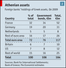 У потенциальных спасителей Греции может возникнуть чувство, что им лучше поспешить. Дефолт хоть и сократит стоимость государственного долга Греции примерно в два раза, но подкосит национальные банки (S&P присвоил четырем из них статус ненадежных). Также это создаст финансовую панику в Европе. Государственные облигации стоимостью около ?213 млрд. находятся за границей. По подсчетам Банка международных расчетов, на конец прошлого года размер кредитов, предоставленных зарубежными банками правительству, банкам и частному сектору Греции, составил ?164 млрд. Неизвестно, какая часть из них приходится на государственный долг. Но если половина государственных облигаций за границей находится у банков, и если владения банков каждой страны пропорциональны общему количеству греческих активов, тогда банкам Еврозоны принадлежит примерно ?76 млрд. (см. таблицу 2). Страны Еврозоны могут почувствовать соблазн допустить дефолт Греции, обречь небанковских инвесторов на убытки и использовать выделенные для спасения Греции средства на укрепление своих собственных банков. Это обойдется примерно в ?53 млрд., если опасения S&P подтвердятся и реструктурирование долга страны повлечет убытки в размере 70%. По сравнению с размером спасительного пакета эта сумма кажется небольшой. Но в случае дефолта Греции все равно придется обратиться за помощью к странам-членам ЕС для финансирования дефицита бюджета, которому потребуется время, чтобы сократиться с 13.6% от ВВП в прошлом году. Похоже, любые действия Греции влетят партнерам в копеечку.