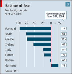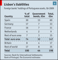 Второй недостаток - это слабость. В Греции хотя бы был бум, когда страна присоединилась к Еврозоне в 2001 году. Португалия же исчерпала все преимущества евро еще до появления валюты. В конце 90-х гг. она переживала здоровый рост, так как ее процентные ставки совпадали со ставками Германии во время подготовки к созданию евро. Но ей так и не удалось полностью восстановиться после последовавшего спада. С 2001 по 2008 гг. годовые темпы роста ВВП составляли в среднем менее 1%, рост производства тоже был слабым. 3%-ый номинальный рост заработных плат еще больше подрывал конкурентоспособность. Португалия жила за счет постепенного притока иностранного капитала. В 2001-08 гг. дефицит текущего счета в среднем равнялся 9% от ВВП. Общий эффект этих дефицитов обуславливает третий недостаток, объединяющий Португалию с Грецией - иностранные долги, накопленные компаниями, домохозяйствами и правительством страны. По данным МВФ, в 2008 году чистый международный долг Португалии (задолженность жителей страны перед иностранцами за вычетом принадлежащих им зарубежных активов) составлял 96% от ВВП, - это даже более высокое соотношение, чем в Греции (см. график 3). Большая часть долга находится у иностранных банков: по данным Банка международных расчетов, в конце прошлого года она составила ?198 млрд., около 120% от ВВП (см. таблицу 4). В основном это кредиты, взятые домохозяйствами и бизнесом. Время от времени долг нужно рефинансировать, что повышает уязвимость Португалии, как и Греции, перед лицом резких перемен в настроениях. Как и у Греции, у Португалии большая часть государственного долга находится за границей, при этом низкая экономическая эффективность страны означает, что она тоже зависит от иностранных покупателей свежего долга.