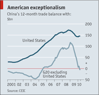 Огромный торговый дефицит США с Китаем отделяет их от остальных членов Большой Двадцатки. Профицит Японии в результате торговли с Китаем составляет 45.5 миллиардов долларов, с Южной Кореей - 59.1 миллиардов долларов. Даже Бразилия может похвастаться профицитом в 14 миллиардов долларов. За последние 12 месяцев Китай продемонстрировал дефицит торгового баланса в рамках торговли с членами Большой Двадцатки, (если не брать в расчет США, а Евросоюз считать как единое целое). Вынесение мировых дисбалансов на повестку дня Большой Двадцатки уже дало свои плоды. Поначалу Китай был против данной идеи, опасаясь усиления давления со стороны остальных участников саммита. Однако, сторонники реформы юаня не питают особых надежд на то, что Большая Двадцатка встанет на сторону США и пойдет против Китая. Более того, Китай чувствует себя настолько уверенным сейчас, что вполне может использовать форум для объявления смены курса политики с учетом своих долгосрочных интересов.