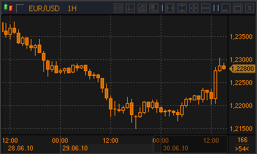 16:10 Me6iuS: Итак, отыгрывая накопившийся еще с утра негатив индекс Доу Джонса закрылся вчера снижением на 2.65%, на отметке 9870. А евро-доллар вчера вечером показал минимум на 1.2150. Однако уже к утру евро поднимался до 1.2238, а после опубликования сегодня итогов по аукциону ЕЦБ по 3-мес. кредитам евро подскочил до 1.2304. Дело в том, что завтра европейские банки должны погасить ЕЦБ 442 млрд. евро по выданным в рамках борьбы с кризисом год назад годовым кредитам. Чтобы смягчить тяжесть одновременного погашения, и рефинансировать часть долга, ЕЦБ, как ранее и обещал, провел аукцион по 3-мес. обязательствам. Интрига была в размере кредита, который понадобится европейским банкам. В итоге ЕЦБ получил запросов только на 131.9 млрд. евро (это меньше, чем прогнозировалось), то есть оставшиеся 310 млрд. евро банковская система Еврозоны готова погасить. Это говорит о том, что, с одной стороны, банковская система не нуждается в больших объемах поддержки ликвидностью, то есть достаточно жизнеспособна и оправилась от кризиса. Это уже позитивный для евро сигнал. С другой стороны, просто сам по себе уход 310 млрд. евро из банковской системы сократит предложение евро на рынке, что прямо приведет к росту евро. Естественно, рынок отыграл эту новость ростом единой валюты. Мы, впрочем, не склонны придавать этой новости большого значения.
