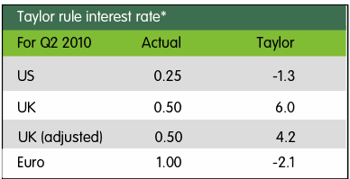 Используя "правило Тейлора", основанное на фактической инфляции относительно ее целевого уровня, исторических показателях экономического роста и реальных процентных ставках, мы подсчитали, какими должны быть официальные краткосрочные процентные ставки в США, Еврозоне и Великобритании. Одним из преимуществ данного подхода является использование фактических данных и исторических связей между переменными, входящими в данное правило, выдержавшее проверку временем. Таким образом, "правило Тейлора" - хороший путеводитель по фактическим изменениям официальных процентных ставок. Однако это не означает, что от него можно не ждать сюрпризов и странных результатов. В этом случае, вывод "правила Тейлора" по Великобритании противоречит объективным данным о том, что происходит в экономике.