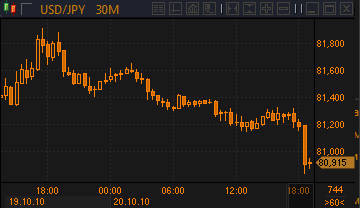 Доллар/иена установила новый пятнадцатилетний минимум на уровне 80.84. Трейдеры отмечают наличие стопов в области 80.80, при этом многие все еще опасаются вмешательства во стороны Банка Японии. Власти страны, вероятно, не станут сидеть сложа руки, а попытаются остановить рост национальной валюты. Текущий курс доллар/иены 80.90. Ближайшее сопротивление 81.00. Источник: ProFinance.Ru - Новости рынка Forex