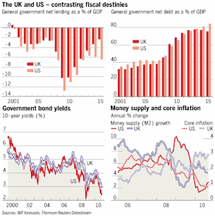 Однако обе страны приговорены к долгому и тяжелому процессу отказа от заемных средств и восстановления после лопнувшего пузыря. Этот процесс прекрасно описан в книге Кармена Рейнхарта из Университета Мэриленд и Кеннета Рогоффа из Гарварда под названием "На этот раз все по-другому" (This Time is Different). Обе экономики работают не на полную мощность. Странам приходится выбирать между краткосрочными рисками, которые грозят замедлением темпов восстановления, и долгосрочными рисками, которые ведут к росту фискальных дефицитов и ставят под сомнение платежеспособность страны. И США и Великобритания полагаются на свою монетарную политику. Пожалуй, учитывая предстоящее фискальное ужесточение, Британия возлагает на нее больше надежд. Как же случилось, что страны пошли разными путями? Какими будут последствия? Насколько количественное ослабление сможет их компенсировать? И, наконец, чему нас могут научить соответствующие роли монетарной и финансовой политики в этой ситуации? Ответ на первый вопрос прост. Фискальный кризис в Еврозоне отрезвил британскую политическую элиту. Конечно, Грецию, страну без центрального банка и без перспектив роста нельзя ставить на одну ступень с Великобританией. Более того, фискальное сокращение, запланированное в Великобритании - ужесточение на 8% от ВВП в течение 5 лет с поправкой на циклические факторы - слишком велико. Но и Штаты, не желающие думать ни о каком фискальном ужесточении в долгосрочной перспектив, также ведут себя безответственно. Последний прогноз по мировой экономике, подготовленный Международным валютным фондом, представляет собой прекрасный анализ возможных последствий фискального ужесточения. В нем приводятся доводы в пользу "стимулирующих сокращений". Кроме того, он показывает, что предыдущие исследования не смогли выявить случаи преднамеренного фискального ужесточения, поскольку искали в первую очередь случаи сокращения дефицита с поправкой на цикл, что совсем не одно и то же.