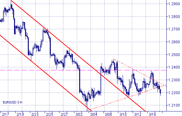 Евро/доллар. Графический анализ. На краткосрочных графиках видно, что евро пробивал симметричный треугольник − фигуру продолжения тенденции, как правило. Прорыв вверх противоречил общему правилу, к тому же он оказался ложным. Дневные графики предлагают нам небольшой медвежий треугольник, нижнюю границу которого, сейчас тестируют цены. Цель по этому треугольнику находится в районе $ 1.1850. Недельный график предполагает тестирование основной линии тренда, расположенной в районе $ 1.15/16. До ее прорыва падение евро укладывается в понятие коррекции. Однако следует помнить, что особенностью коррекции является трудность определения момента и точки ее окончания.
