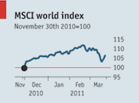 В свою очередь, оценить последствия арабского политического кризиса несколько сложнее, потому что цены на нефть уже росли на фоне улучшения прогнозов по экономическому росту в мире. В то же время, добрые 25% роста в этом году связаны непосредственно с опасениями относительно перебоев с поставками. Как правило, повышение цен на нефть на 10% сокращает мировой рост на 0.2%. В начале года предполагалось, что мировая экономика вырастет на 4-4.5%. По грубым подсчетам, эти два кризиса отнимут от темпов роста мировой экономики от 0.25% до 0.5%. Однако на деле последствия могут оказаться куда драматичнее. Кризисы по своей природе образуют густой туман неопределенности. Компании придерживают запланированные инвестиции в основные средства и не расширяют деятельность, пока туман не рассеетсся. Инвесторы ищут защиты на рынке облигаций и теряют интерес к фондовым рынкам.