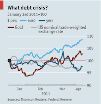 После землетрясения и цунами, поразивших Японию 11 марта, японская иена показала просто чудеса эквилибристики. С самого начала спекулянты, или "жалкие воришки", как выразился один их японских чиновников, делали ставку на то, что компании начнут репатриацию средств для покрытия страховых выплат и затрат на реконструкцию. В результате, иена стремительно выросла сразу после катастрофы. Руководство страны забеспокоилось о том, как дорогая валюта отразится на процессе восстановления, поэтому обратилось за помощью к странам Большой Семерки, которые вняли мольбам и провели совместную интервенцию, выбросив на рынки иен на сумму более 25 млрд. долларов. Иена упала почти на 3% за один день. Более того, в дальнейшем падение продолжилось, и 6 апреля курс японской валюты к доллару составлял уже 85.00. Сейчас на нее влияют силы совершенно иного свойства. Иена растет, когда среди инвесторов начинается паника и массовый отказ от рисковых активов, например, как это было 12 апреля, после объявления о том, что атомному кризису в Японии присвоен самый высокий уровень опасности, такой же, как катастрофе в Чернобыле. Аналитики признают, что такие валюты как иена и швейцарский франк традиционно считаются безопасными, поэтому они растут в период рыночной нестабильности. Цены на золото достигли новых рекордных высот 11 апреля - еще один любимчик инвесторов в трудные времена. Кроме того, золото пользуется спросом из-за того, что ультра-аккомодационная политика и растущие цены на нефть провоцируют усиление инфляционных давлений.