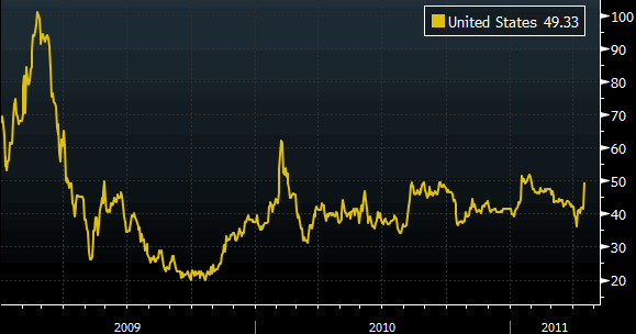 Вчерашний скачок в стоимости CDS, размером в 2.98 стандартных отклонения, рассчитан за период данных с 1 января 2009 года. Теперь стоимость CDS значительно выше среднего значения, которое находится на уровне 42.8 пункта.