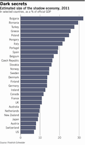 Согласно большинству исследований, итальянская теневая экономика по масштабам приближается к 25% от ВВП. Средний показатель для развитых стран - 15%. В Германии он чуть выше среднего значения, а в США и Великобритании, по данным Организации экономического сотрудничества и развития, чуть ниже. Высокие налоги считаются одной из причин процветания теневой экономики. Чем выше налог и административное бремя на бизнес, тем больше теневая экономика в стране. Исторические факторы также играют не последнюю роль. Так, в Италии, Испании и Греции законодательная власть слабее, доверие к государству ниже. Решение проблемы следует искать в реформах, направленных на упрощение системы налогообложения и снижения налоговых ставок, снятие барьеров для развития рынка труда и улучшение юридической системы. Слабое государство объясняет, почему в Бельгии, разделенной языковым барьером, теневая экономика составляет 17.4% от ВВП по сравнению с 10% в более централизованной Голландии.